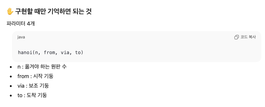가장 무거운 원판을 세 번째 장대로 옮겨야 한다는 점과 N개의 원판을 옮기는 과정이 N-1개의 원판을 옮기는 과정을 포함한다는 점까지는 생각해냈는데 재귀 함수 구현에서 GPT의 도움을 받았다.