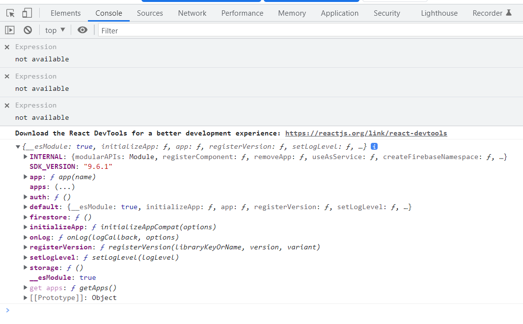 8. index.js에 console.log(firebase)를 하여 웹페이지에 아래와 같이 뜨는지 확인하면 끝이다