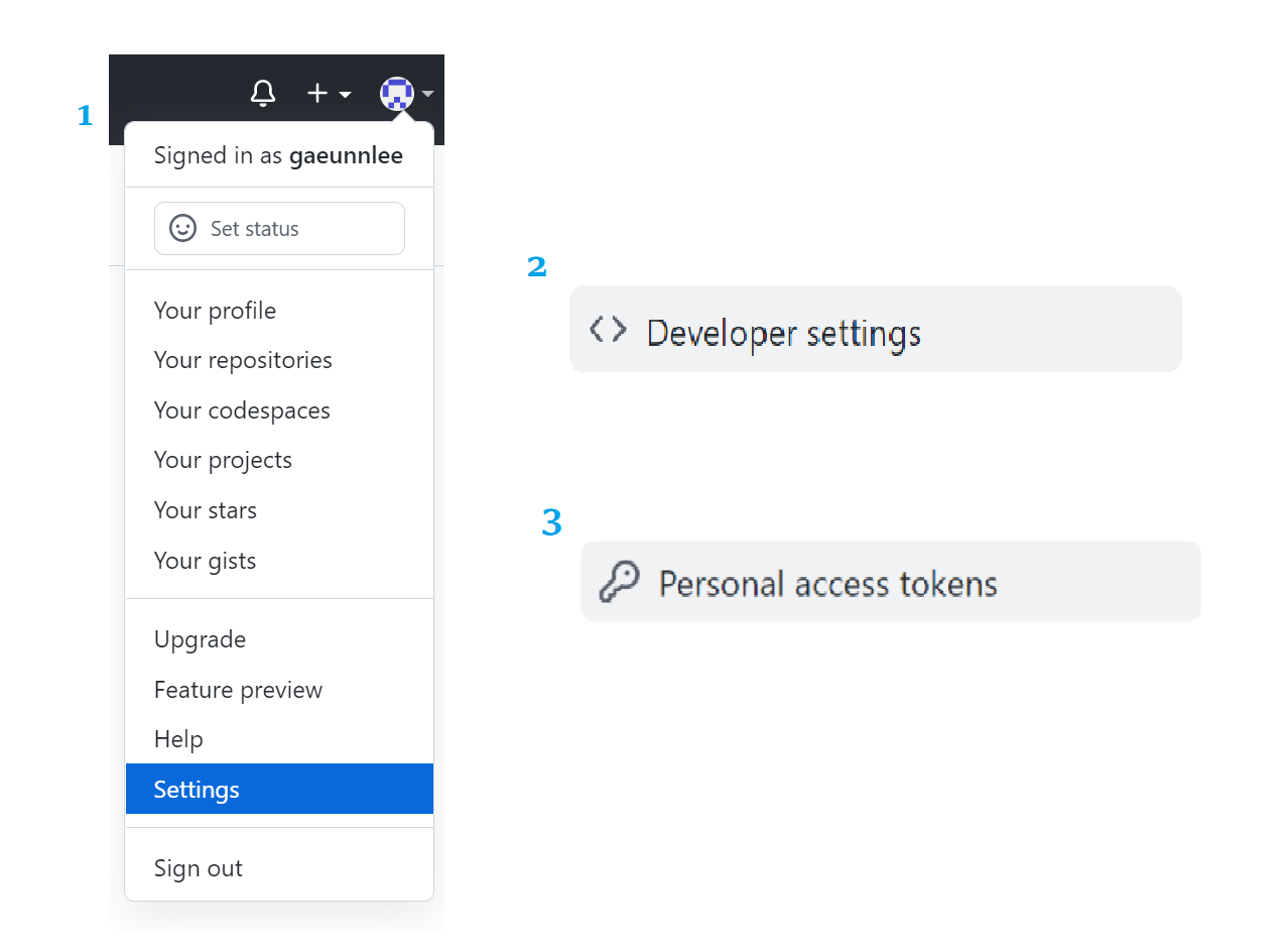 1. 토큰 발급 2. 토큰 관리 3. 새 Repository 생성 4. 로컬과 원격 연동 git으로 관리하려는 폴더를 vs code로 연다 commit 되지 않은 변경 내역이 있다면 이를 마쳐야 한다 그리고 위에서 복사한 명령어를 터미널에 붙여넣는다 붙여 넣은 명령어 설명 git remote add origin 원격저장소주소.git 로컬 저장소와 원격저장소(github) 연결 / origin = 원격저장소명 다른 이름도 가능 git branch -M main 기본 브랜치명을 main으로 지정 git push -u origin main 현재 브랜치와 명시된 원격 브랜치 기본 연결 5. push & pull